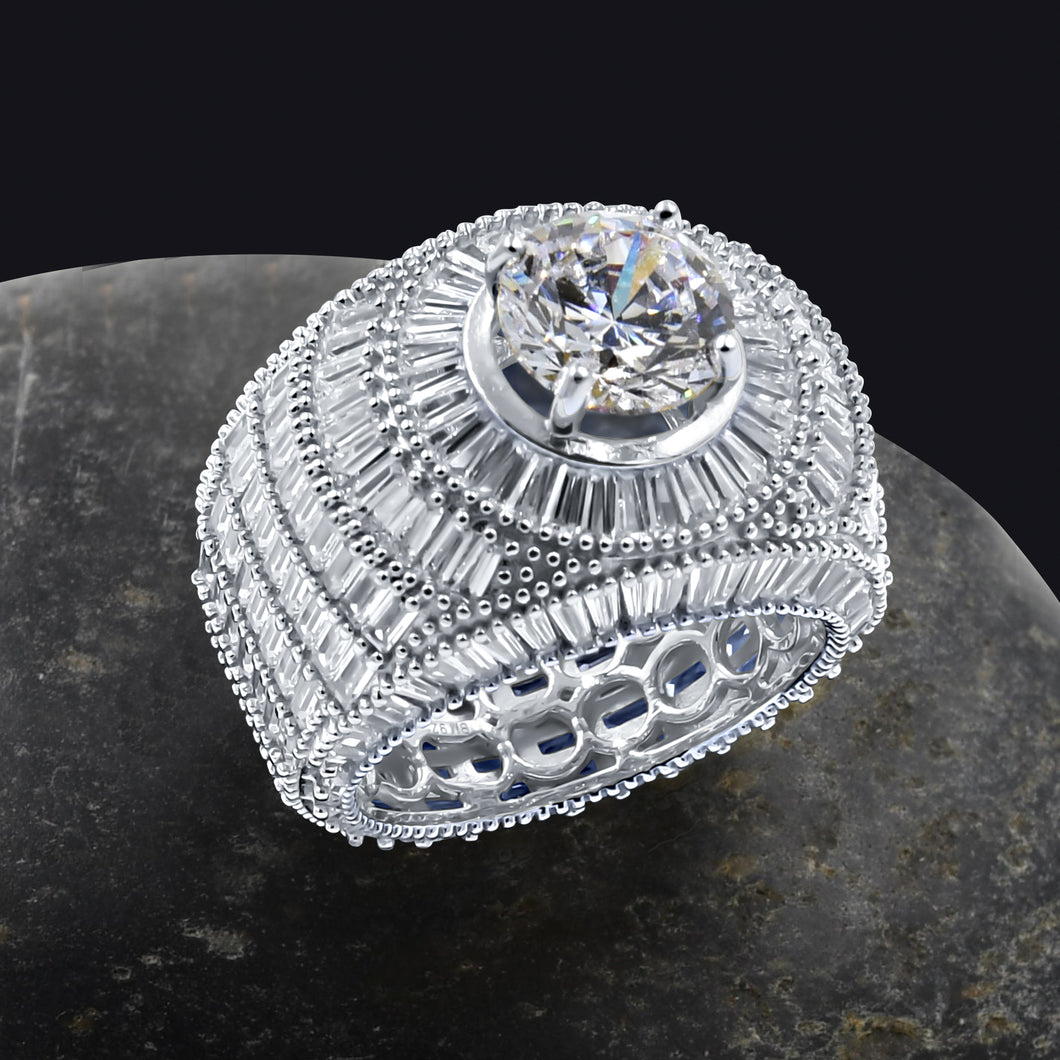 ETHEREAL, lovely and transcendent; this chic is nimbly designed to be in your finger and let your sparkle never grow dim. Silver cubic zirconia stones in a catchy circular pattern, make this ring one distinctive thing to glimmer in your jewelry box.