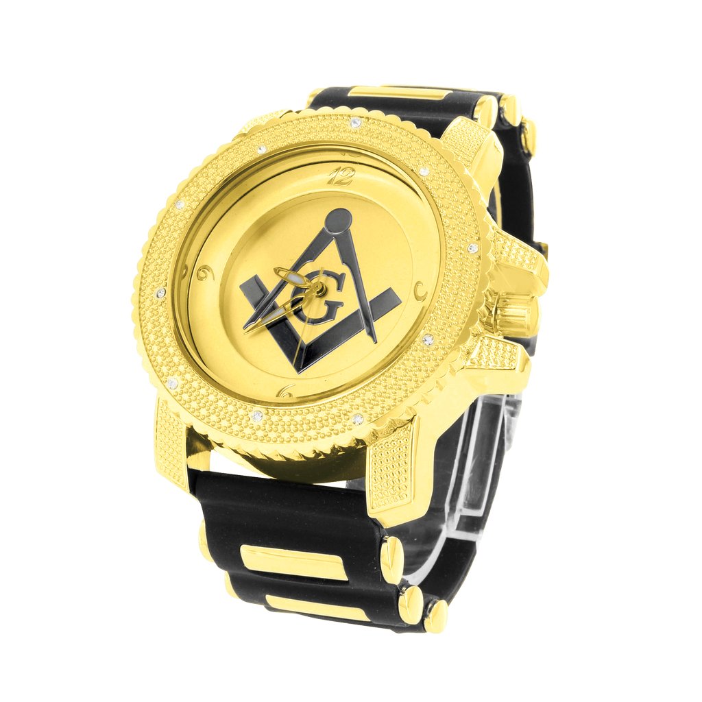 14K Yellow Gold plated Solid Alloy watch with unidirectional rotating bezel and Iconic Masonic emblem on dial with Silicone rubber bullet band accented with Czech crystal on the bezel. Japan movement and battery, Stainless Steel back cover and splash water resistant.