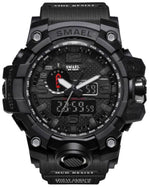 Jet Black, 3ATM Water Resistant, Solid Rubber Construction, Alarm, Stop Watch, Light, Calendar, and much more. Army Seal Style Fashion Watches