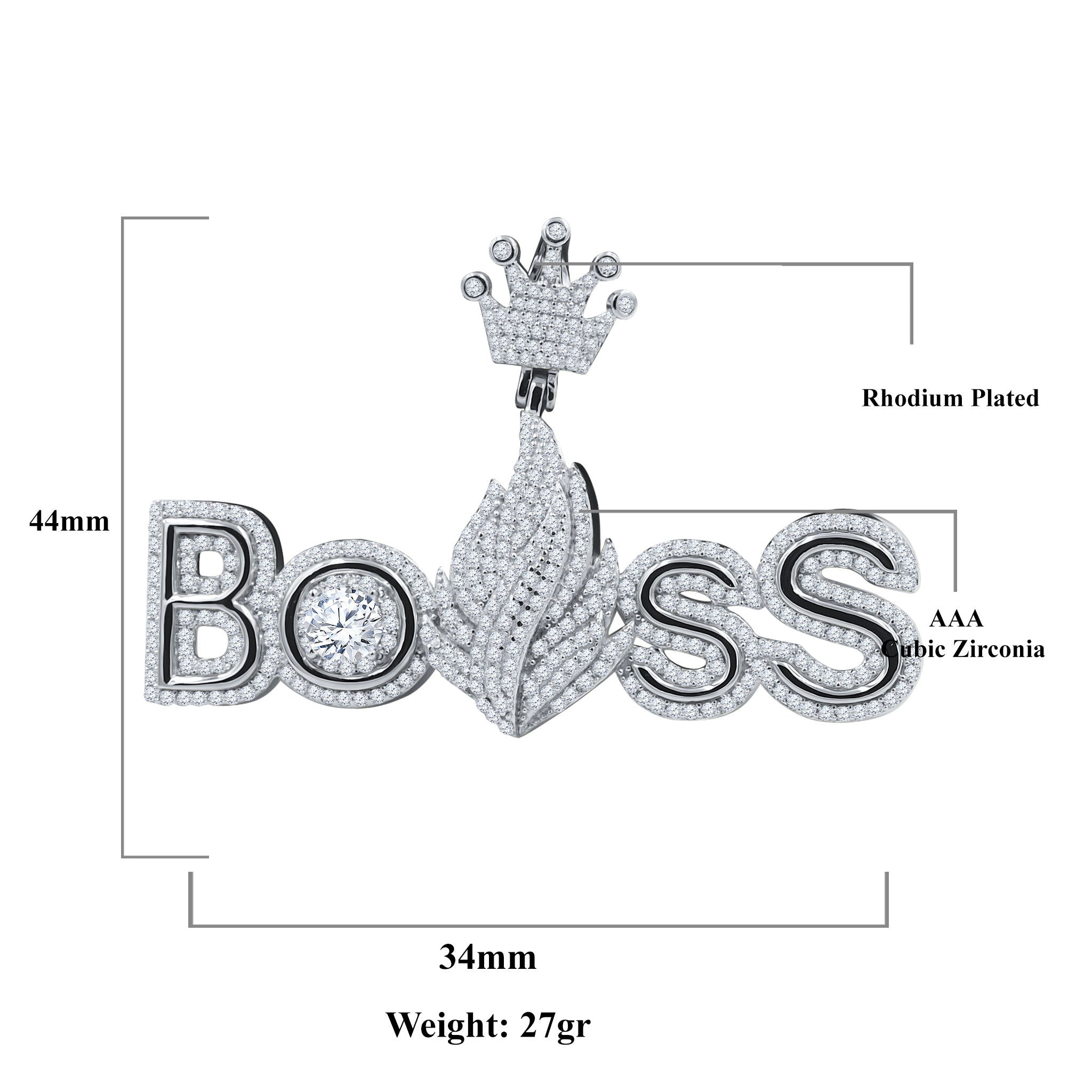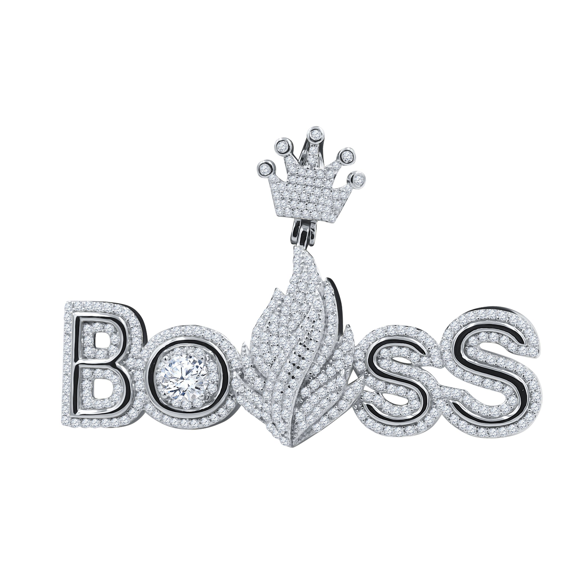 OMORFOS; You were in search for an OG distinctive message pendant and we have this peculiar designed accessory just for you. Declare your unspoken elements of luxuriance and exuberance with this ‘boss’ slogan. Cached in all glistening CZ stones from top to bottom to reflect volumizing radiance and beam, this pendant gives an awe-inspiring look you deserve.